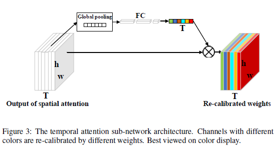 如图,T是我们上个步骤获得的所有w组成的数据块。从左往右一共6大份,因为每个特征得出来一份。h为特征的高,w为特征的宽。我们对数据块T从逐通道做一次平均值pooling。这个操作叫做全局平均pooling(global average pooling)。得到的pooling值送入一个三层的全连接网络中,最终得到6个数字。6个数字再分别与上面提到的6大份权重相乘,得到经过时间注意力机制调整之后的最终权重T。
