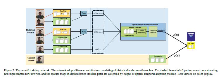 总体框架是一个双胞胎网络。然后将前T(实验中,T=6)帧的信息整合起来,最后使用相关滤波方法,计算最终响应值。