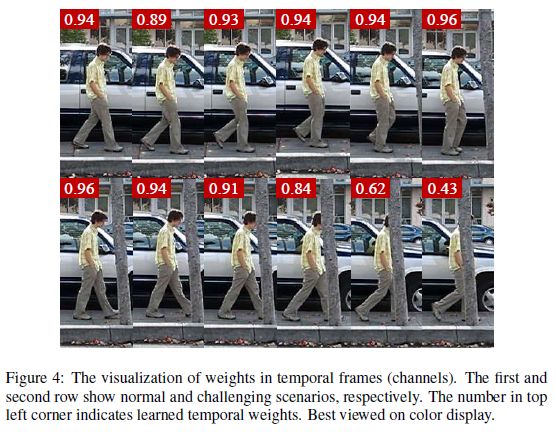 下图展示了时间注意力机制下得到的6个权重的可视化结果,有遮挡的帧权重就比较低。