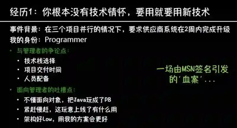 用现在的眼光来看,我当时做事都是面向简历的开发,而不是面向目标。技术管理者要讲究平衡,而不是简单说哪个技术栈特别好。
