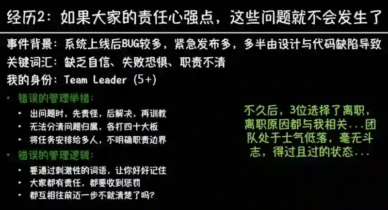 最终的结局是什么?有三位同学选择离职。离职的原因都跟我有关,留下来的团队处于士气低落、毫无斗志、得过且过的状态。其实我是非常恼火的,我就觉得这些人如果都能像我一样,那事情怎会这个样子?我经常把这句话挂在嘴边,“如果是我,那怎样怎样”。