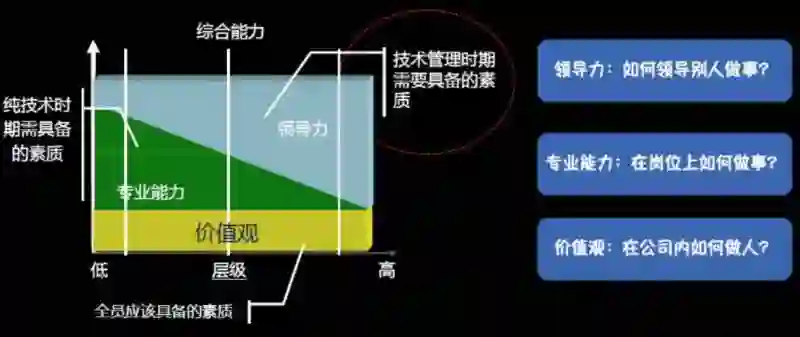 我总结了一个模型图,底层是价值观,应该是全员具备的素质;往上是专业能力,是纯技术时期应该具备的素质;再往上才是领导力,是技术管理时期需要具备的素质。