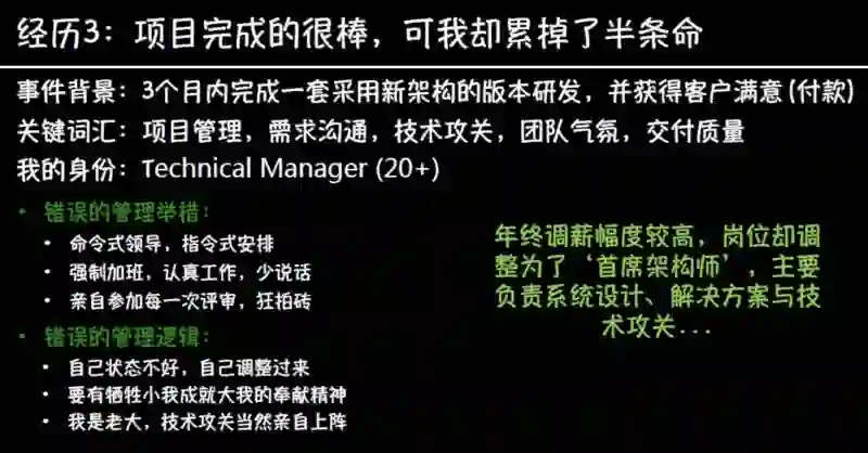 最终的结果是什么?整个项目完成得非常的棒,可我丢了半个命,非常累。我的年终调薪幅度也很高,但是岗位有所调整。可能领导觉得你技术特别厉害,但是团队对你的评价不高,你去做技术好了,主要负责技术设计、解决方案、技术公关类。