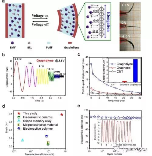 图3.石墨炔电化学驱动器性能表征
