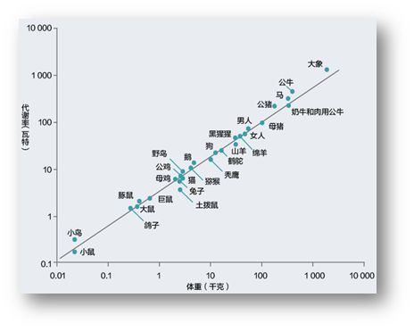 生物学家马克思·克莱伯对大量哺乳动物进行统计后,于1832年发现的一个有趣的规律:基础代谢率与体重的3/4次幂成正比的关系。