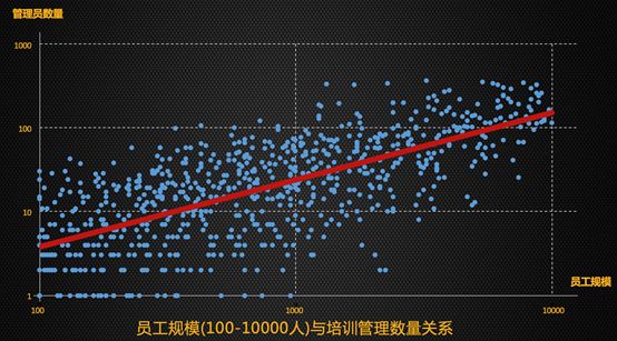 横坐标是学员的规模,纵坐标是管理员数量,我们看到企业规模与培训管理员也存在近似的规律。参考《规模》一书中所谈到的假设: