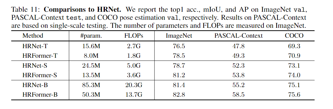 可以观察到,在模型和计算复杂度较低的各种配置下,HRFormer 在三个任务上分别以2.0%、1.5%和1.6%性能显著优于 HRNet,而只需要大约50%的参数和FLOPS。
