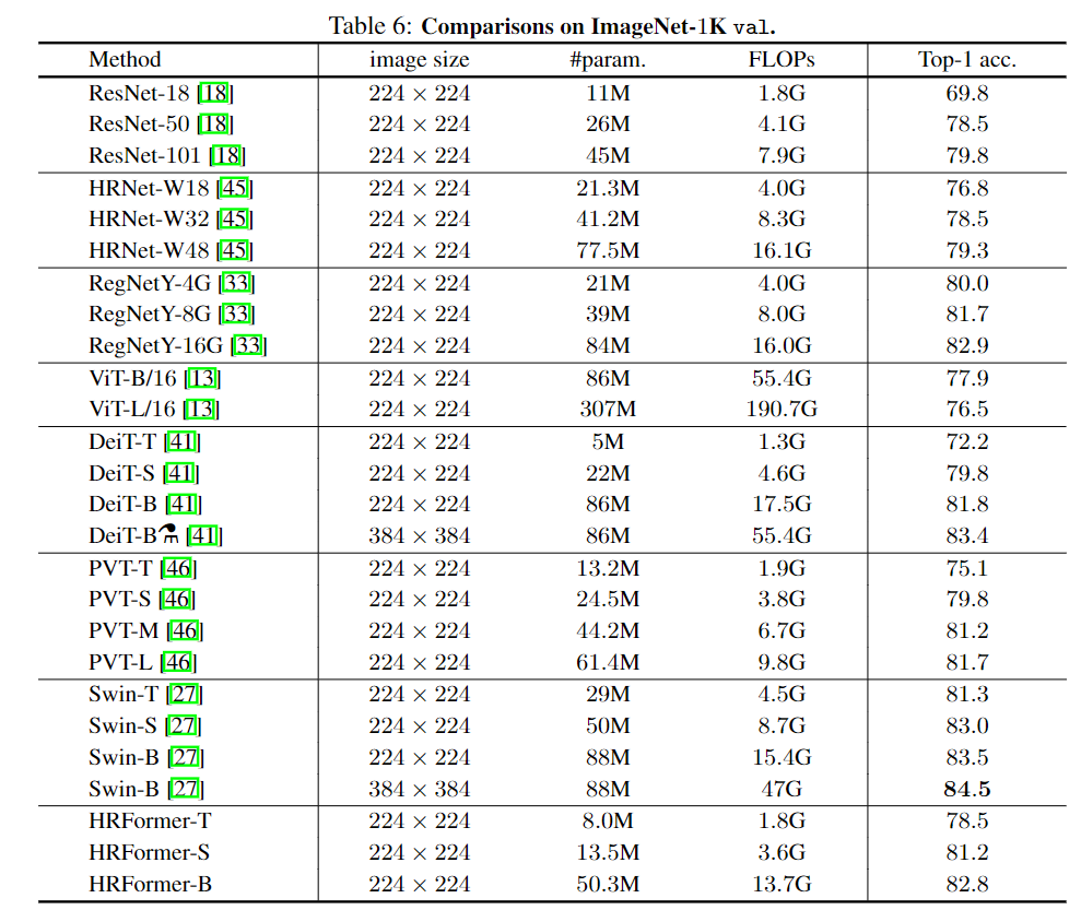实验结果可以看出,HRFormer-B比DeiT-B 模型性能提高了1.0%,同时节省了近40%的参数和20%的FLOPs。
