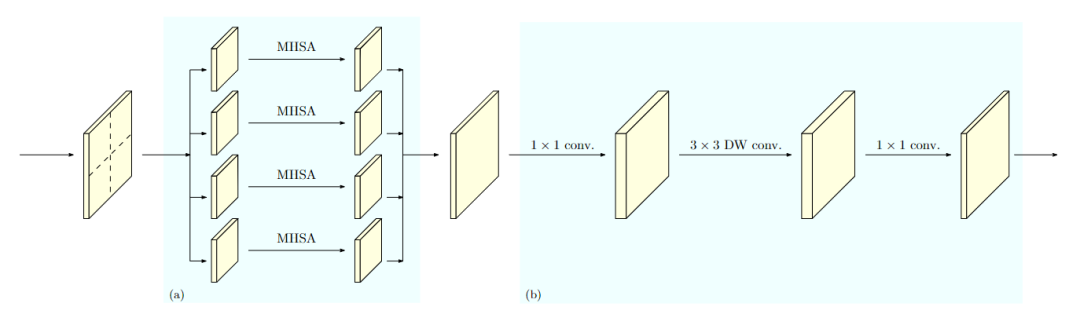 并且在前馈网络(feed forward network)中引入了3×3深度卷积,使得这个卷积层能够跟踪局部窗口的自注意力来在没有直接连接的图像窗口之间交换信息。这有助于扩展接收范围,对于密集的预测任务至关重要。