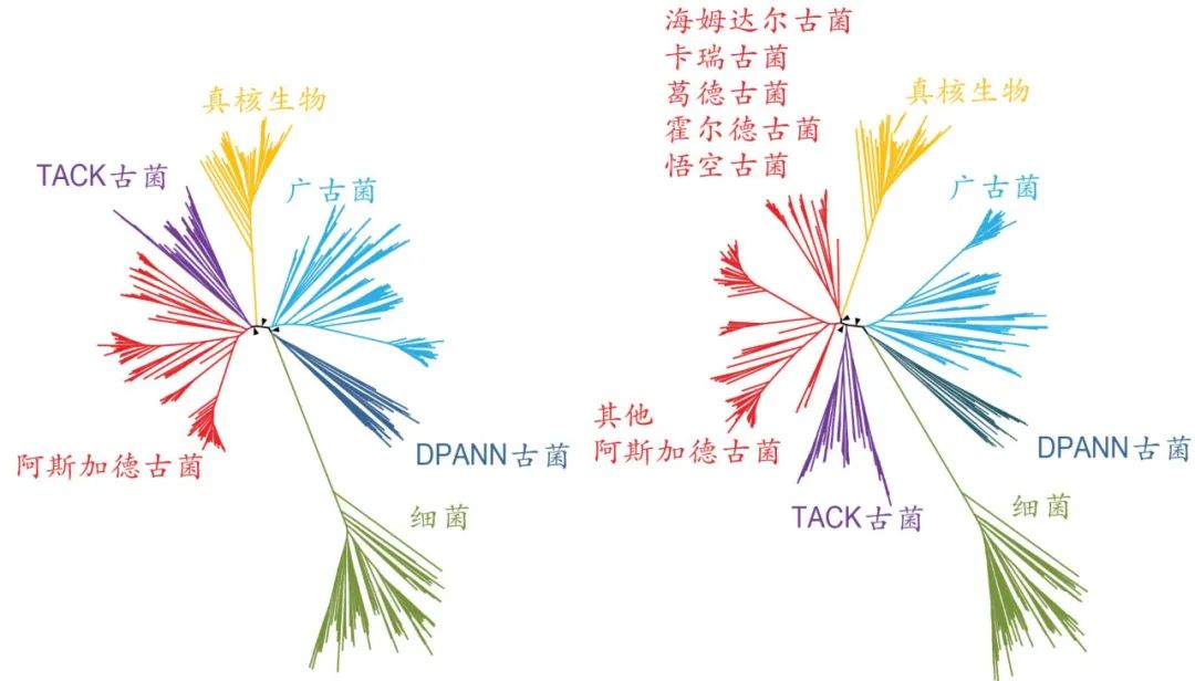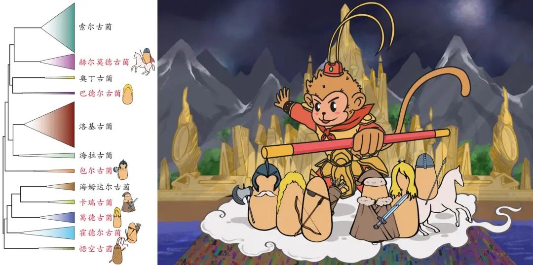 图为阿斯加德古菌超门的系统发育分析(图中红色为我们新命名的7个门类),右图为卡通人物形象