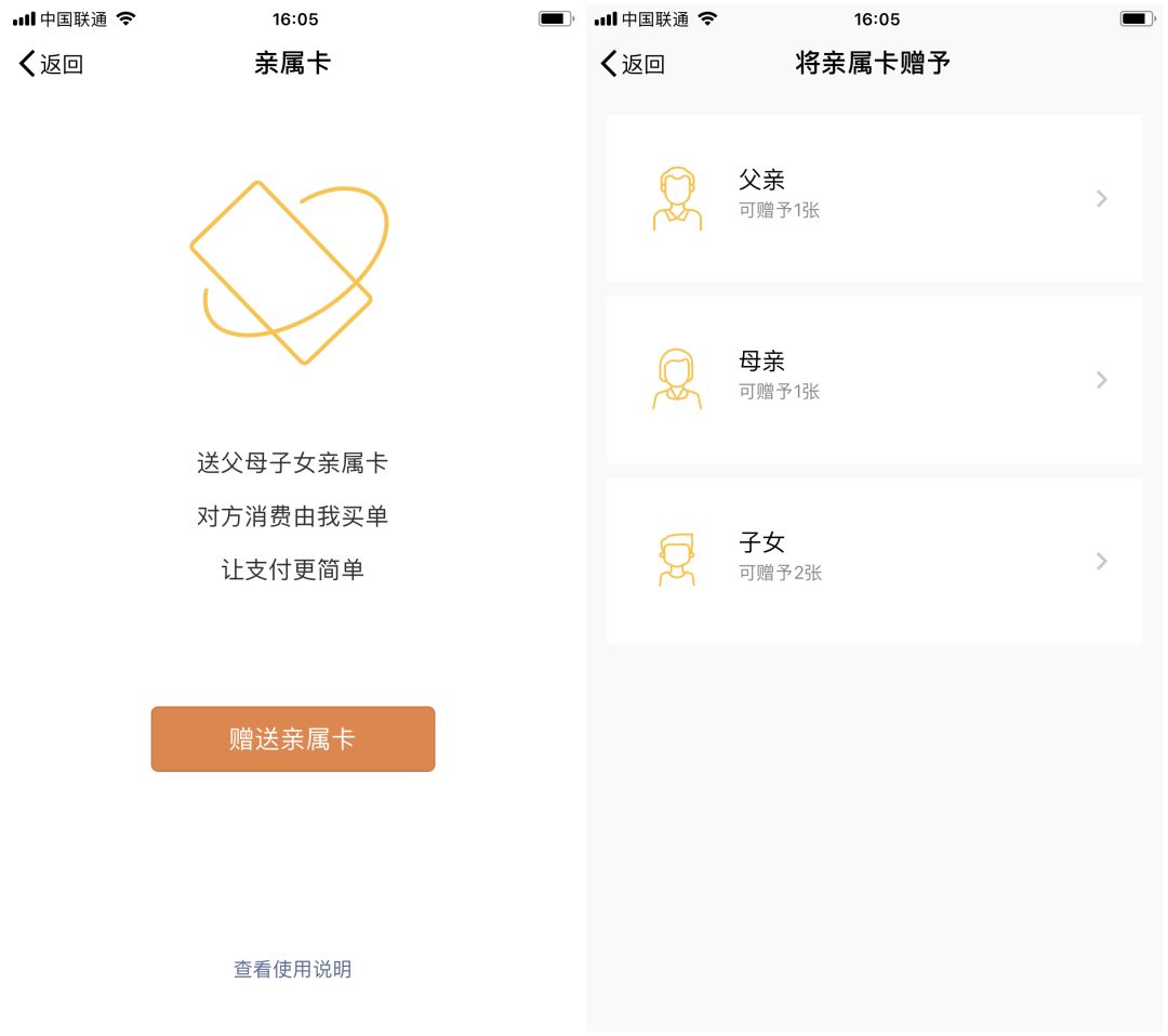 进入到【亲属卡】页面后,页面会让你选择【赠送亲属卡】,点击一下,接下来就会选择赠送父亲一张、母亲一张、子女2张,从中选择一个。