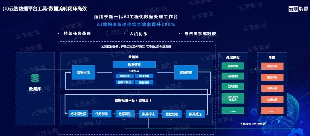 云测数据新一代解决方案中基于这些需求打造了数据处理工作台,支持持续任务处理、人机协作,同时以标准API接口与各类系统对接,将AI数据训练过程中的综合效率提升200%。