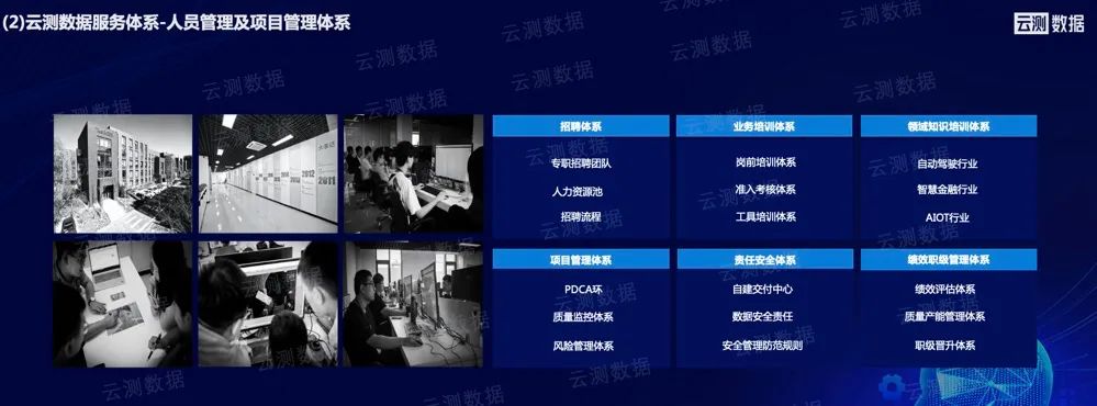 对此,云测数据推出数据服务体系。其中人员管理体系涵盖招聘、业务培训,以及自动驾驶、智慧金融、AIOT等重点行业的领域知识培训。项目管理体系则以标准化的流程把控数据质量,将数据标注最高精度提升至99.99%。