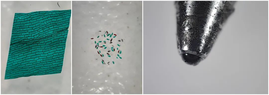 (微距 左:洋葱表皮切片,中:草履虫,右:圆珠笔尖)
