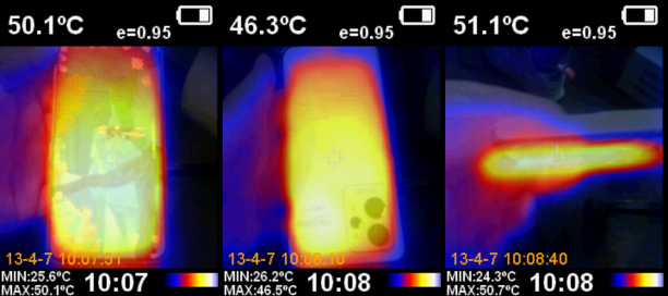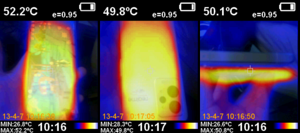 不过,10 分钟时 GT2 Pro 的 CPU 温度已经干到了 61℃,手机正面最高处 50.1℃,上边框 50.7℃,后盖 46.5℃,此时已经几乎无法使用正常的握姿来进行游戏操作,最后我们是以一种看起来比较奇怪的姿势完成了 30 分钟测试,30 分钟时整体温度表现和 10 分钟时候基本相同,正面最高温度 52.2℃,上边框为 50.8℃,后盖为 49.8℃,看来这个 realme 这个豪华堆料散热还是有用的,cpu 相比静息状态下上升 13℃,热量基本都被传导到了中框。最重要的,即使在这种极限条件下,GT2 Pro 也没有降低亮度和 CPU 频率来辅助散热,这就很棒了,不会像某些手机会降低亮度。而且在停止测试后,手机很快能恢复到正常温度。