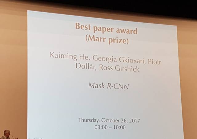 当地时间 10 月 22 日,两年一度的计算机视觉国际顶级会议 International Conference on Computer Vision(ICCV 2017)在意大利威尼斯开幕。今日,大会公布了本届 ICCV 的获奖论文,Facebook AI 研究员何恺明获得最佳论文奖,同时是最佳学生论文的作者之一。算上此前在 CVPR 2009、CVPR 2016 上的两篇「最佳论文」,何恺明现在已获得了四个最佳论文称号。