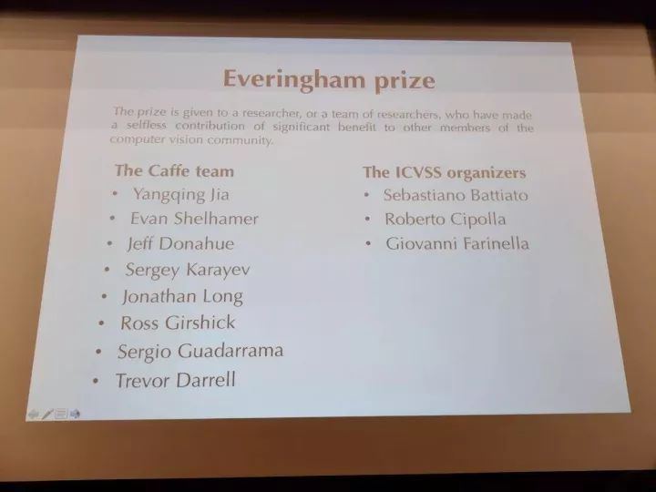该奖项主要是为了奖励那些对计算机视觉社区作出无私贡献的研究团队或研究员。ICCV 2017 的 Everingham Prize 授予贾扬清领衔的 Caffe 团队,以及 ICVSS 组织者团队。