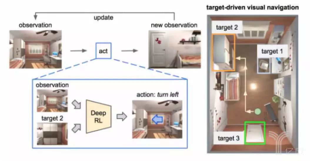 16年,李飞飞组放出了一篇论文,基于深度强化学习,在以目标图像为输入的情况下,不建图去找东西。大致思路是:根据机器看到的图,决定怎么走,然后再看图,再决定新走的一步,直到找到东西。论文将目标图像作为输入,训练出来的神经网络具有通用性。