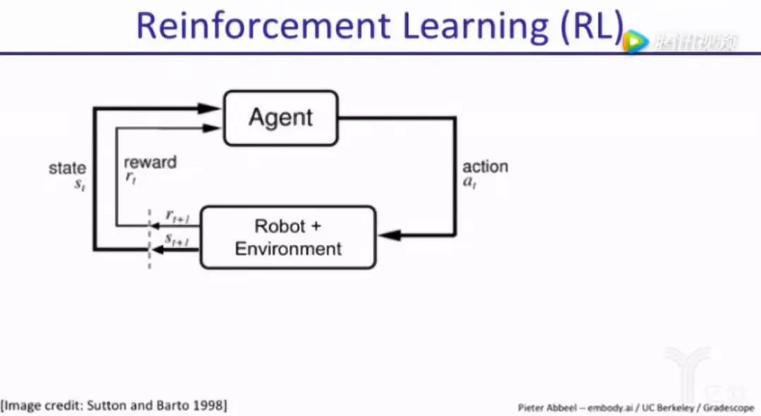强化学习框架中,有一个包含神经网络的Agent负责决策。Agent以当前机器人传感器所采集到的环境为输入,输出控制机器人的行动命令action,机器人行动后,再观察新的环境状态和行动带来的结果Reward,决定下一步新的行动action。Reward根据控制目标进行设置,并有正反向之分。例如,如果以自动驾驶为目标,正向的Reward的就是到达目的地,反向就是不能达到目的地,更不好的Reward就是出车祸。然后重复这个过程,目标是最大化Reward。
