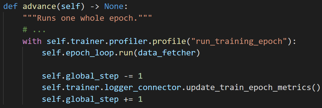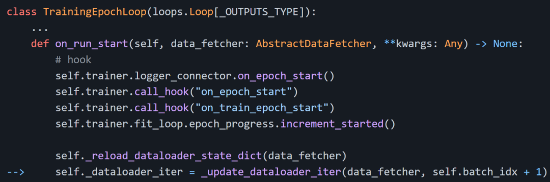 我开始探究 Lightning 源码,查看导致循环(loops)变慢的指令,我发现了一些问题:Loop.run 调用 Loop.on_run_start、Loop.on_run_start 重新加载 dataloader,如下图所示:
