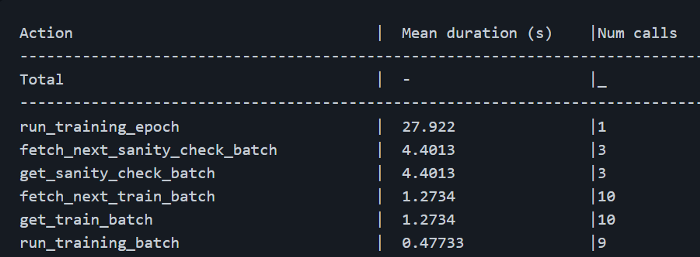 Lightning 的 profiler 与上下文管理器一起运行并计算给定块花费的时间。它可以轻松搜索特定的 profiler 操作,以运行「run_training_epoch」为例 。