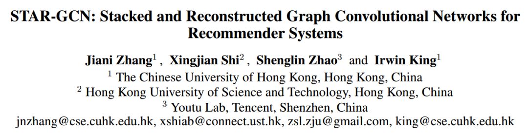STAR-GCN: Stacked and Reconstructed Graph Convolutional Networks for Recommender Systems 为了提高推荐系统的性能,特别是在冷启动场景中,我们提出了一种新的叠加重构图卷积网络(STAcked and Reconstructed Graph Convolutional Networks, STAR-GCN)体系结构。STAR-GCN采用了一堆GCN编解码器与中间监督相结合,以提高最终的预测性能。与one-hot编码节点输入的图卷积矩阵完成模型不同,我们的STAR-GCN学习低维用户和项的潜在因素作为输入,以抑制模型空间复杂度。此外,我们的STAR-GCN可以通过重构隐藏的输入节点嵌入来生成新节点的节点嵌入,这实质上解决了冷启动问题。此外,在对基于GCN的链路预测任务模型进行训练时,我们发现了一个标签泄漏问题(label leakage issue),并提出了一种避免该问题的训练策略。对多个评分数据集的实证结果表明,我们的模型在五分之四的数据集中取得了最先进的性能,并在冷启动场景中预测评分方面有了显著的改进。 论文地址:https://www.ijcai.org/proceedings/2019/0592.pdf代码地址:https://github.com/jennyzhang0215/star-gcn