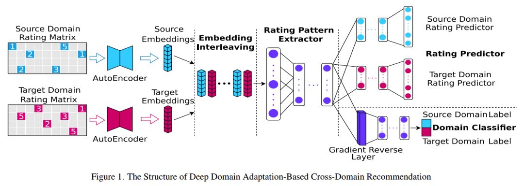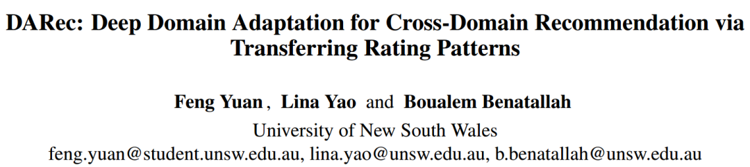 DARec: Deep Domain Adaptation for Cross-Domain Recommendation via Transferring Rating Patterns 跨域推荐长期以来一直是推荐系统中的主要研究课题之一,近年来,人们提出了各种深度模型来进行跨域的知识迁移,但大多侧重于从辅助内容(如图像和评论文本)中提取抽象的可迁移特征,而评分矩阵本身中的模式很少被触及。本文在域自适应概念的启发下,提出了一种深度域自适应模型(DARec),该模型能够在不依赖任何辅助信息的情况下,从评分矩阵中提取和传递模式。我们在公共数据集上实证地证明了我们的方法在几种最先进的可供选择的跨域推荐模型中取得了最佳的性能。 论文地址:https://www.ijcai.org/proceedings/2019/0587.pdf