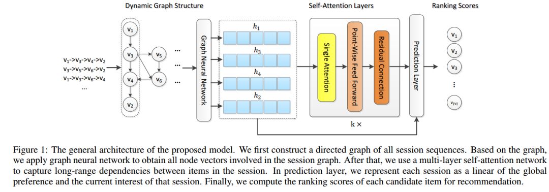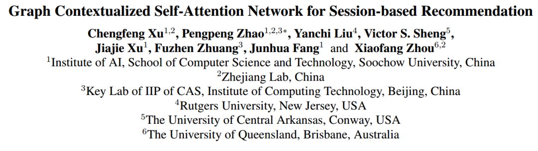 Graph Contextualized Self-Attention Network for Session-based Recommendation 基于session的推荐是许多在线服务(比如电子商务、媒体流)中的一项关键任务。近年来,自注意力网络(SAN)在不使用递归或卷积网络的情况下,在各种序列建模任务中取得了显著的成功。然而,SAN缺乏在相邻项上存在的局部依赖关系,并且限制了它学习序列中项的上下文表示的能力。本文提出了一种利用图神经网络和自注意力机制进行session推荐的图上下文自注意力模型(GC-SAN)。在GC-SAN中,我们动态地构造了session序列的图结构,并通过图神经网络(GNN)捕获了丰富的局部依赖关系。然后,每个session通过应用自注意力机制来学习长期依赖关系。最后,每一个session被表示为全局偏好和当前兴趣的线性组合。在两个真实世界的数据集上进行的广泛实验表明,GC-SAN的性能始终优于最先进的方法。 论文地址:https://www.ijcai.org/proceedings/2019/0547.pdf