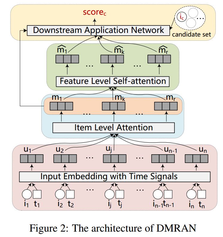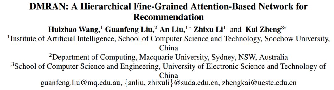 DMRAN: A Hierarchical Fine-Grained Attention-Based Network for Recommendation 用于下一个项目推荐的常规方法通常基于RNN或具有时间编码的一维注意力模型。它们很难保留不同交互之间的长期依赖关系,或者很难捕获细粒度的用户偏好。本文提出了一个双最相关的注意力网络(Double Most Relevant Attention Network,DMRAN),它包含两个层,项目级注意力层和特征级自注意力层,即从用户的历史行为序列中提取最相关的项目,并分别提取相关项目中最相关的方面(aspects)。然后,我们可以捕获细粒度的用户偏好,以便更好地支持下一项推荐。在两个真实世界的数据集上进行的广泛实验表明,与最先进的方法相比,DMRAN可以提高推荐的效率和有效性。 论文地址:https://www.ijcai.org/proceedings/2019/0513.pdf