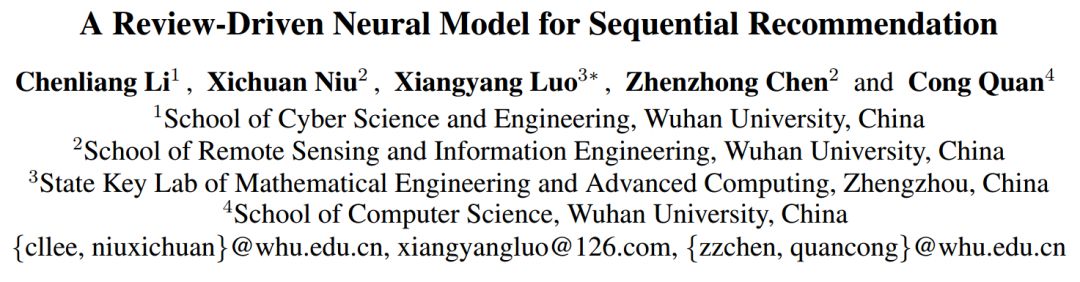 A Review-Driven Neural Model for Sequential Recommendation 对购买的项目的写评论是在电子商务中表达用户意见的独特渠道。近来,已经提出了许多基于深度学习的解决方案,通过利用用户评论来进行评分预测。相反,很少有人试图利用由用户评论所涵盖的语义信号来完成协同过滤的任务。本文通过考虑用户“内在偏好(长期)”和“序列模式”(短期),提出了一种新的基于评论驱动的神经序列推荐模型(简称RNS)。详细地说,RNS被设计成用从评论中提取的aspect-aware的表示来编码每个用户或项目。给出用户的历史购买商品序列,设计了一种新的层次关注机制,用于在联合级(union-leave了)和独立级(individual-level)捕获序列模式。在三个不同领域的真实世界数据集上进行的广泛实验表明,相对于最新的最先进的序列推荐模型,RNS获得了显著的性能改进。 论文地址:https://www.ijcai.org/proceedings/2019/0397.pdf