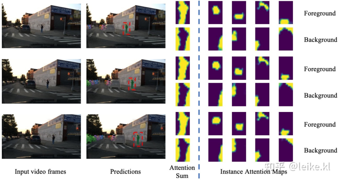 【Instance-level】对红色虚线框中的汽车的 instance attention 可视化。研究者选择前四个前景 / 背景原型作为示例,其中每个都专注于特定的汽车子区域,例如第一个 prototype 关注于车头的位置,并且这一 attention 分布随着时间的推移具有隐式无监督一致性。