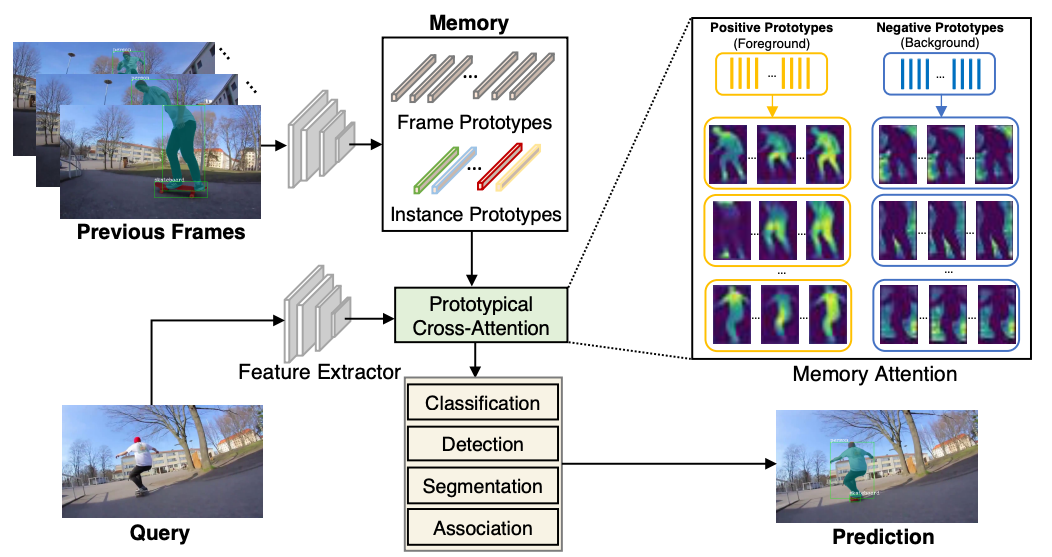 PCAN 首先将历史信息(memory bank)中的高分辨率特征压缩到帧级和实例级的原型(prototypes)中,然后通过原型交叉注意力(prototypical cross-attention)操作,从由原型组成的 space-time memory bank 中去提取和利用过去帧中包含的丰富的外观、纹理和共享信息等。
