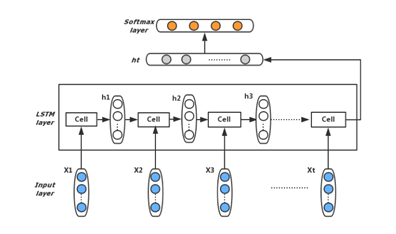 基于CNN的出行消费意图识别虽然对文本进行深层特征抽取得到了文本最终表示,但在特征抽取过程中没有很好地考虑文本的语序问题。对于聊天机器人的用户对话文本,由于其表达较短,且词语的先后语序关系对文本的实际含义影响较大,为了能更好的对文本的时序关系建模,本文采用基于LSTM的出行消费意图识别方法。LSTM模型由Hochreiter和Schmidhuber[7]提出,它不仅对文本的时序关系具有良好的建模能力,而且当用户输入的文本较长时,可以有效处理文本的长期依赖问题。本文中的LSTM结构如图3所示,该模型由输入层,长短期记忆层和Softmax分类层组成,其中Softmax层与CNN模型中相同,LSTM层由一系列重复的Cell组成,得到最后一个Cell的输出送入Softmax层。该模型的输入层与CNN中不同的是,词向量是依次按照顺序依次送入到对应的Cell中,以保证聊天文本的时序性。