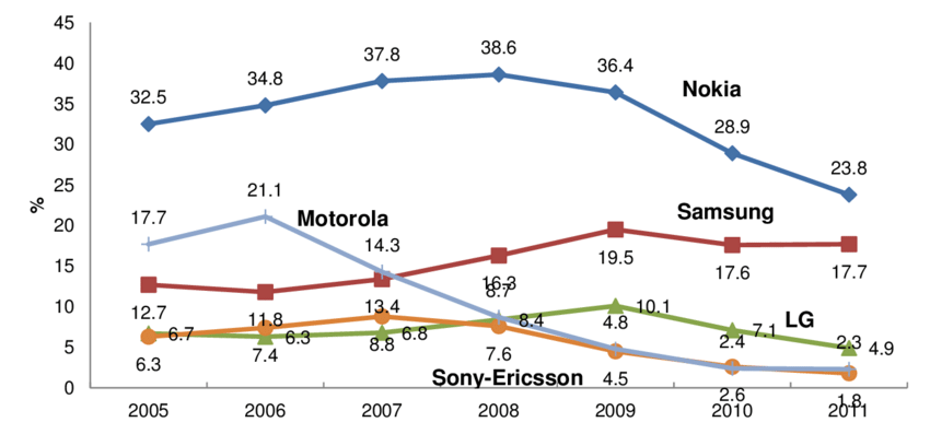 下面是2005-2011全球手机市场份额的折线图,可以看到,在2007年之后,除了三星有一定幅度的增长,其他手机厂商都不可避免地呈现出衰落地趋势,其中以摩托罗拉和索尼爱立信最为明显。