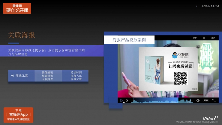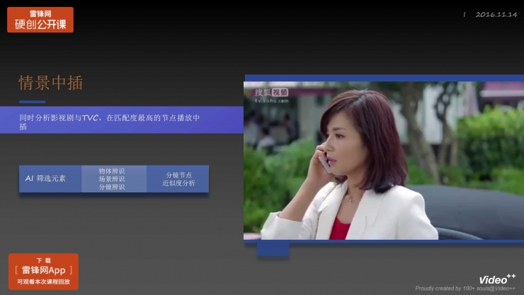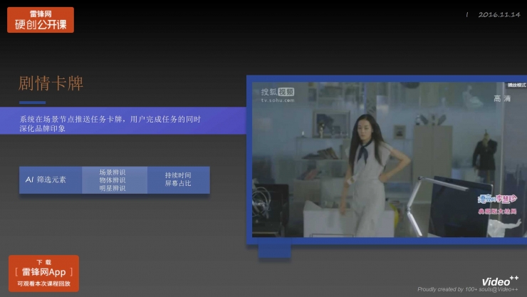 Video++专注于消费级视频大流量场景的AI科技公司,以视觉识别和大数据为基础,实现视频场景匹配和广告自动投放,实现在视频中的购物,百科,虚拟植入,卡牌互动,投票,发红包等互动功能,为观众提供新型的互动体验。