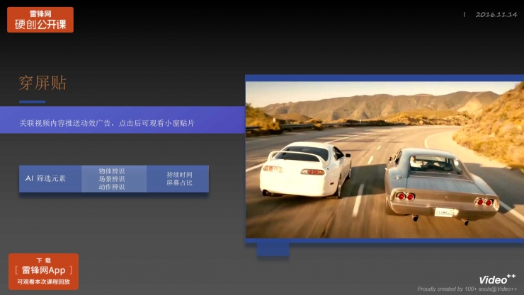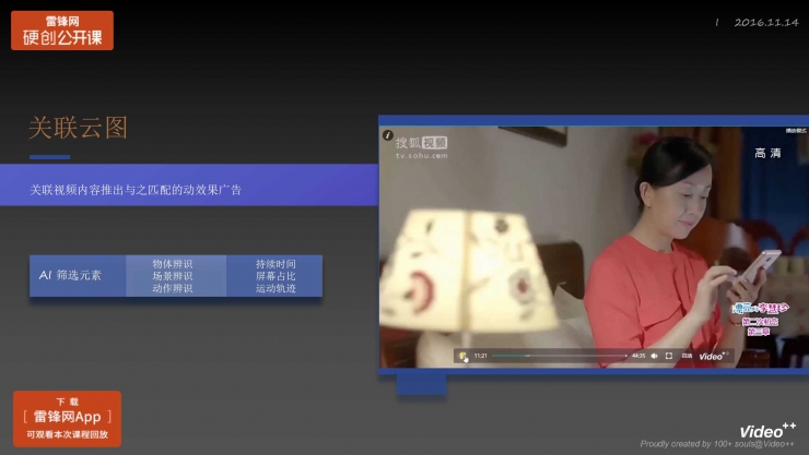 雷锋网AI掘金志邀请到了Video++人工智能事业部研发Team Leader张奕为大家讲解人工智能在消费级视频场景中的应用。(后台回复关键词“视频广告”可下载全版PPT。)