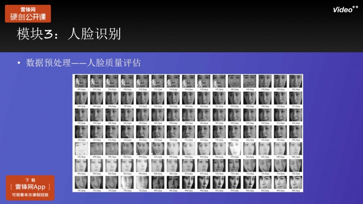 在识别之前,对人脸数据的预处理还包括人脸质量的评估。这一模块的设计也是与消费级视频的特点息息相关的。由于消费级视频里的图片同样出现参差不齐的现象,所以一些低质量的人脸识别的结果是不可信的,这将干扰最终的视频结果。因此我们在算法框架中,加入了人脸质量评估的算法,以过滤低质量的人脸图片,保证人脸数据的准确率。