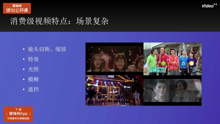 上文也提到,工业级视频由于条件固定,所以场景单一,而消费者视频则来源多样,后期还有很多加工,从而场景更加复杂。在消费者视频里,经常能看到场景的切换、缩放和拼接,还有字幕,淡入淡出等功效设置。在很多消费者视频中,如舞台综艺节目的频繁移动,交接的改变,都会对整体或者局部产生模糊。以上因素都会对人工智能分析视频内容产生一定程度的干扰,这就要求人工智能算法需要具备更高的鲁棒性,以减少这些因素带来的干扰。
