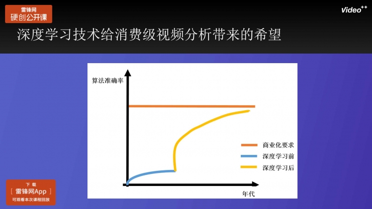在深度学习技术应用之前,人工智能识别技术也在不断发展,但是在实际应用中,算法准确率与产品商业化要求之间还存在较大的差距。深度学习技术的出现,极大的提升了算法的准确率,拉低了其与产品商业化要求的差距,使得人们看到了人工智能技术近年来在消费级视频等相关领域应用的希望。
