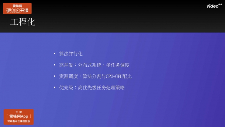 在有了算法架构之后,已经能够实现应用所要求的功能,做成演示系统,但要满足产品化的要求还需要精心设计后的工程构架。工程化的构架所要解决的问题是让算法在生产的高密发状态下生成快速的运行,提供稳定的服务。为了达到这一目的,工程化可以从以下方面进行优化: