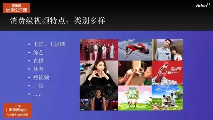再来看消费级视频的第二个特点。其实其本身可分为很多种类,如电影、综艺、体育和广告,还有这两年非常火的直播、短视频等等。这些子类的消费者视频的内容形式之间又存在着很大的差异,所以也给不同子类的通用算法提出巨大的挑战。
