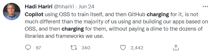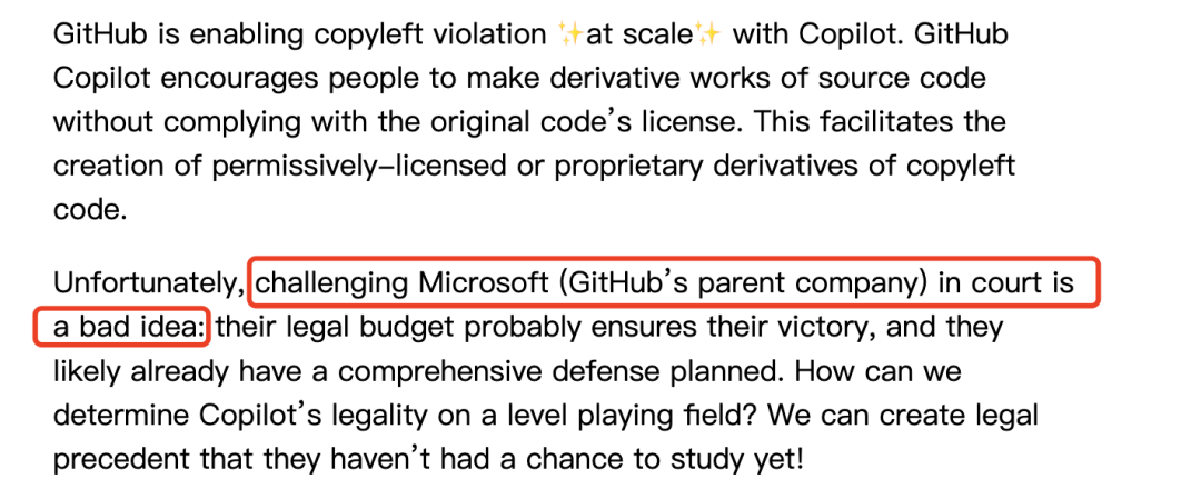 他表示,「Copilot用OSS(Open Source Software,开源软件)来训练,然后GitHub还要收费。这就跟我们大部分人用OSS开发app,还要收钱一样。那是不是也得给用的数据库和框架付钱啊?」