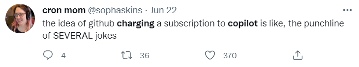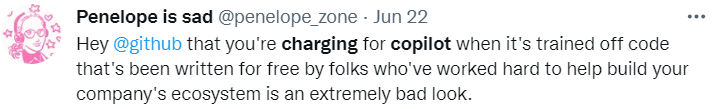 网友Penelope is sad同样表达了自己的不满,他表示,「GitHub你收Copilot钱?Copilot上都是我们这些人辛辛苦苦免费写的代码,我们帮你们搭建了不错的生态。你还要收钱?」