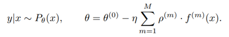对新输入 x 的预测 y|x 是以条件分布 P_θ 的形式完成的,其参数 θ 通过 M 个基础学习器输出(对应于 M 个梯度提升阶段)与一个初始分布 θ(0) 的叠加组合得到。