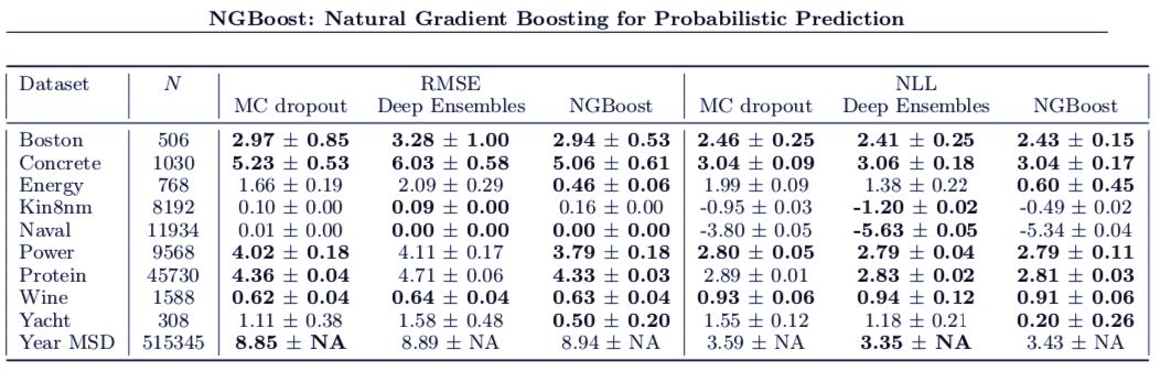 NGBoost 在 RMSE 和 NLL 上的表现都很有竞争力,尤其是在更小型的数据集上。