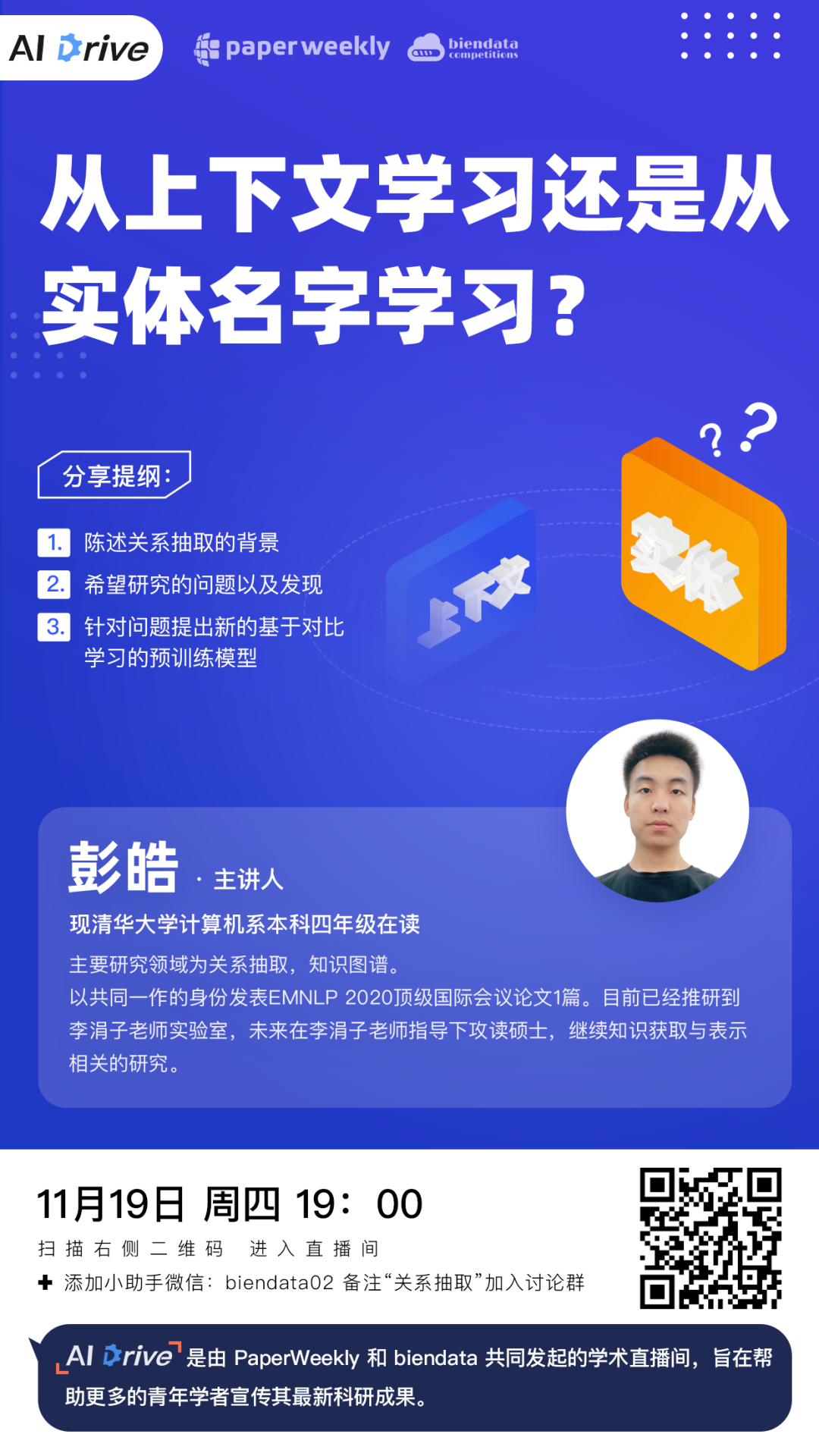 本期 AI Drive,我们邀请到清华大学计算机系本科生彭皓,为大家解读其发表于 EMNLP 2020 的最新工作。对本期主题感兴趣的小伙伴,11 月 19日(周四)晚 7 点,我们准时相约 PaperWeekly B 站直播间。