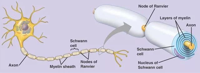 左边包裹在神经元轴突上的节状组织就是髓鞘,右边是放大的髓鞘结构图。