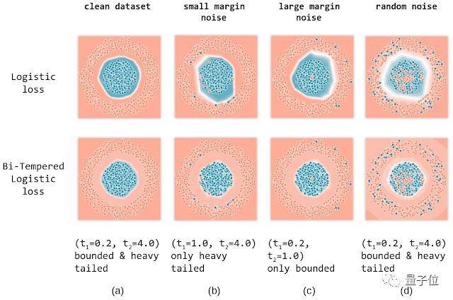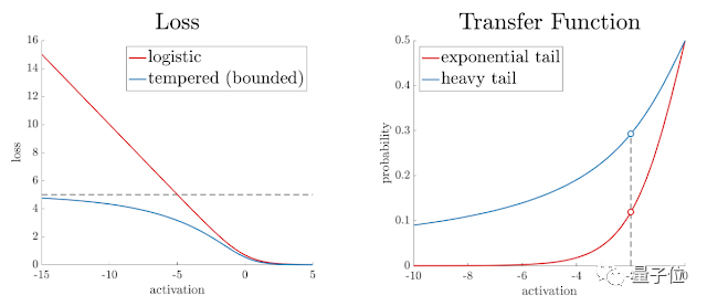 谷歌通过引入两个可调参数的双稳态逻辑损失函数(Bi-Tempered Logistic Loss)来解决上述两个问题。这两个参数分别是“温度”(temperature)t1和尾部重量(tail-heaviness)t2。尾部重量其实就是指传递函数尾部下降的速率。