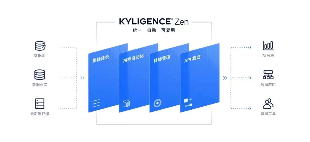 指标中台产品陆续面世,产品均以实现 OLAP 下的数据治理,减少计算逻辑和数据逻辑的重复为目标,但最终将走向何方,还需要进一步探索与实践。Kyligence 也于近日宣布推出了一站式云端指标中台 Kyligence Zen。据了解,Kyligence Zen 是处于数据层和应用层之间的指标中台,可以统一管理所有业务指标,自动完成数据加工、指标计算等过程,企业可以在不同应用中实现指标的复用,形成以指标为核心的共同语言,提高协同管理的效率。