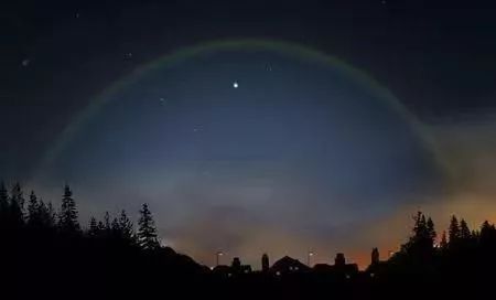 这是一种非常罕见的自然现象,是月光下出现的彩虹,又叫黑夜彩虹、黑虹。
